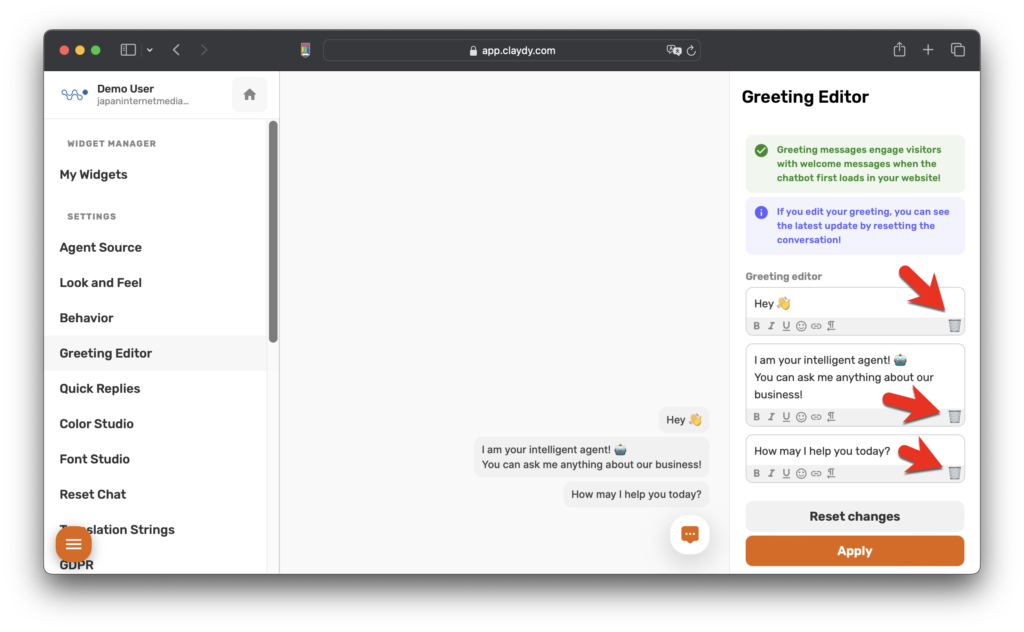 グリーティング メッセージを管理するには、 グリーティング エディタ ページ CLAYDYダッシュボード内。