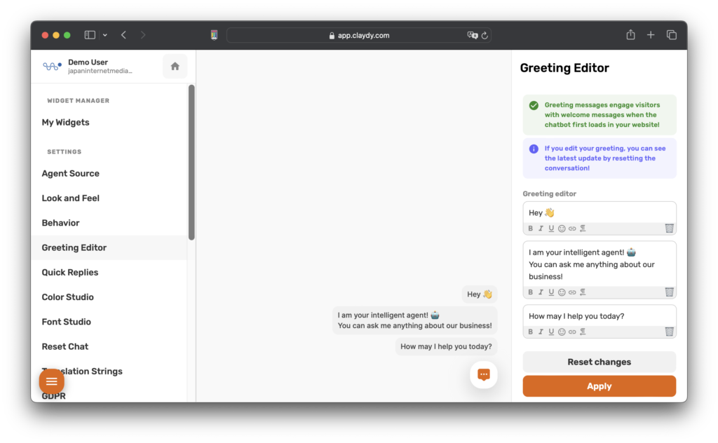グリーティングエディタは、チャットボットが暖かくフレンドリーなメモで会話を開始することを保証するCLAYDYの注目すべき機能です。