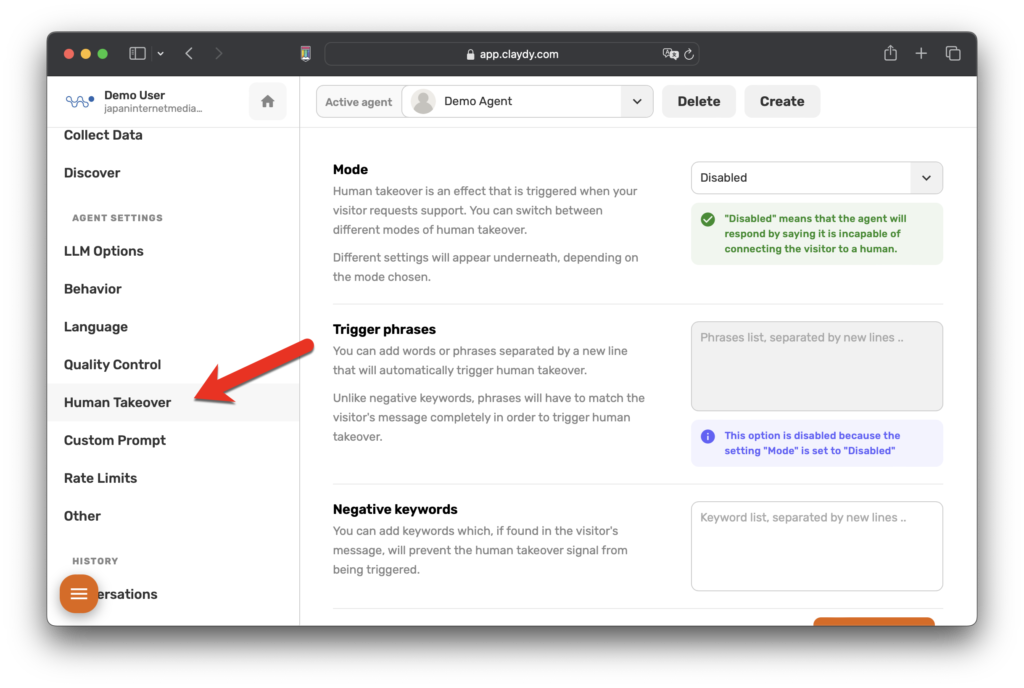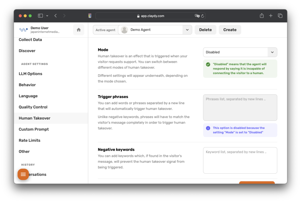 A3:はい、CLAYDYのヒューマンテイクオーバー機能を無効にすることができます。無効になっている場合、Aiチャットボットは、人間の代表者との直接の接続が不可能であることを訪問者に丁寧に通知します。