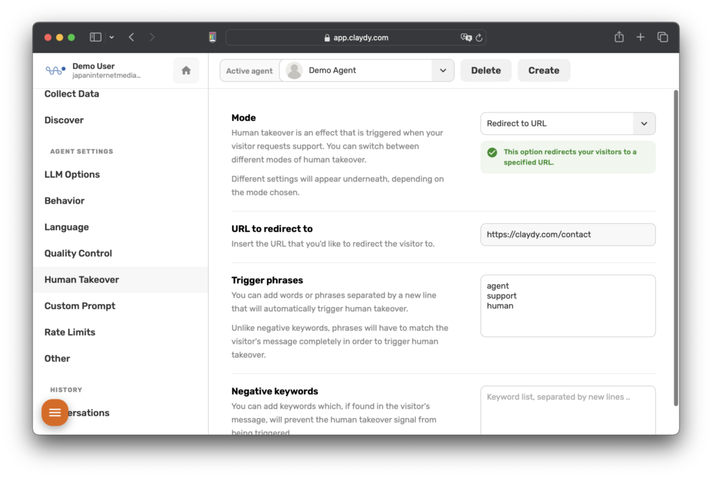 A2: CLAYDY の Human Takeover 機能は、URL へのリダイレクト、メール アドレスの提案、ライブ チャットを埋め込むためのカスタム コードの実行など、さまざまなモードでカスタマイズできます。