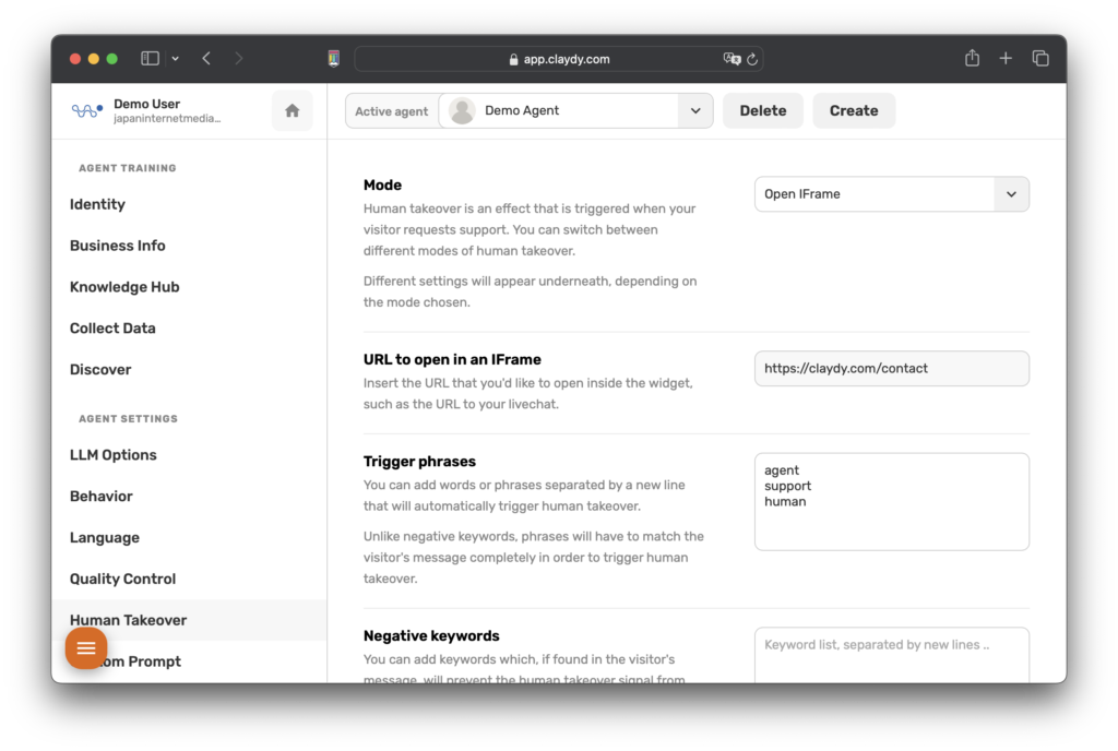 A1: Human Takeover は CLAYDY の機能で、訪問者が人間の代表者との会話を要求したときに、自動応答から人間の対話へのシームレスな移行を可能にします。