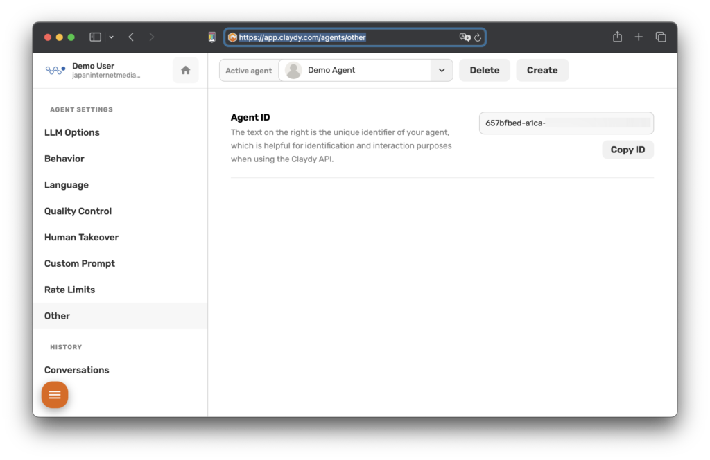 A2:CLAYDYエージェントIDを見つけるには、CLAYDYアカウントにログインし、 CLAYDYエージェントIDページ が表示され、エージェントIDがテキストフィールドに表示されます。