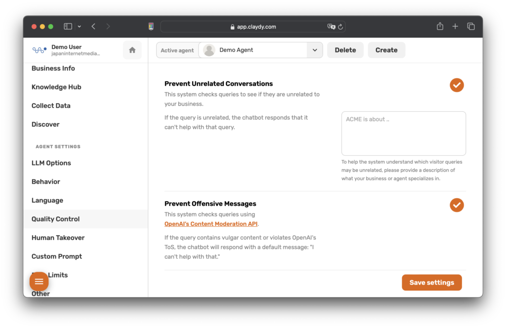 CLAYDYでは、Webサイトの訪問者がAIチャットボットとやり取りする品質を優先しています。最適なユーザーエクスペリエンスを確保するために、会話の品質向上に特化した3つの品質管理システムを細心の注意を払って設計しました。