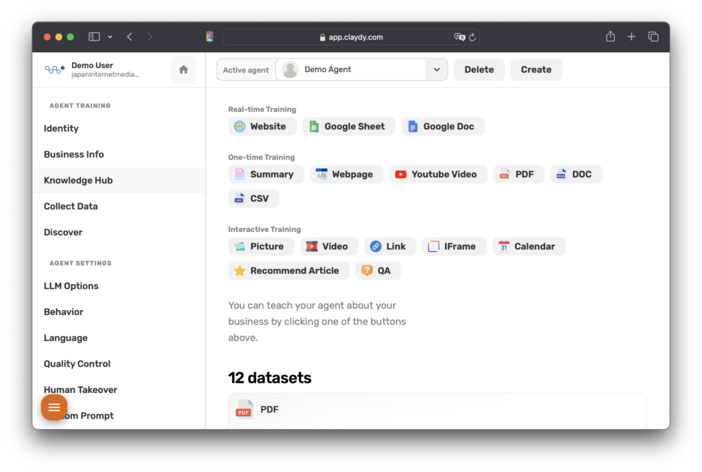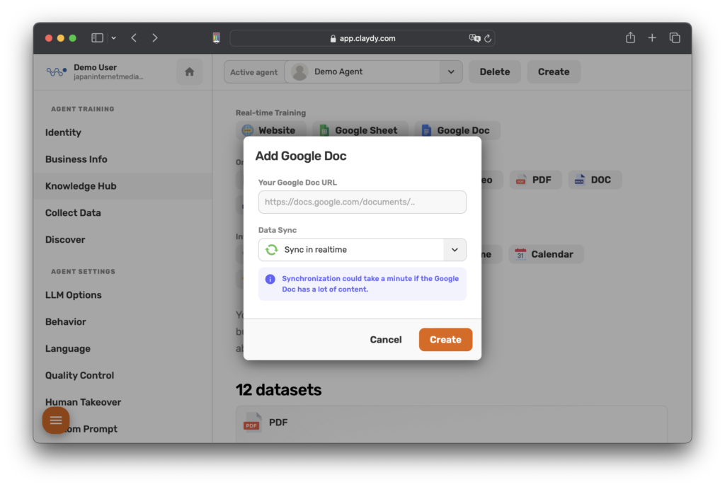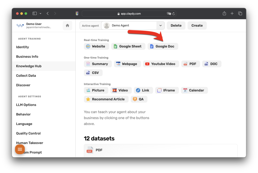 Google Docsを使用したAIチャットボットのトレーニングは、CLAYDYを使用すると簡単です。次の簡単な手順に従ってください。