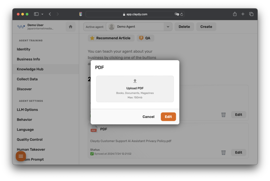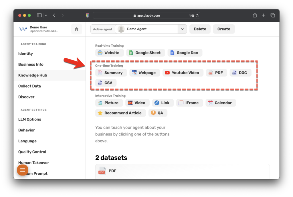 CLAYDYは、ユーザーが自分のビジネスや特定の主題についてエージェントを教育するためのデータセットを提供できる1回限りのトレーニング機能を提供します。
